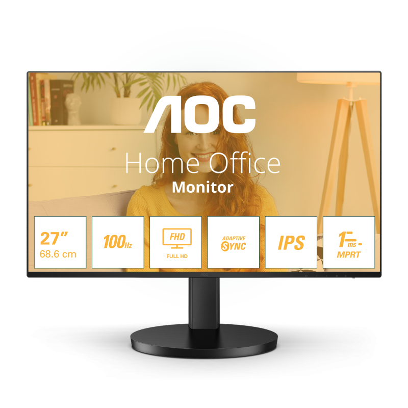 Monitor AOC 27″ 27B3HA2, Diagonal (inch): 27, Diagonal (cm): 69, Aspect ratio: 16:9, Panel: IPS, Resolution: 1920×1080, Refresh Rate: 100Hz, Response time GtG: 4ms, Response time MPRT: 1ms, Brightness (max): 250 cd/㎡, Contrast (static) : 1300:1, Contrast (dynamic): 20M:1, Viewing angle: 178°/178°, Color Gamut Type: NTSC, Color Gamut Coverage: 84%, Colours: 16.7M, Speakers: 2Wx2, VESA Wallmount: 100×100, Tilt: -5° ~ 23°, D-SUB: x1, HDMI: x1, AUX: x1 3.5mm Audio OUT